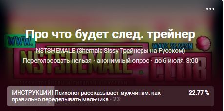 Лапочки, в группе и на сайте идет голосование по выбору темы сисси-трейнера, выпускаемого на средства из банка сообщества. Форма из ВК: VK.Widgets.Poll("vk_poll", {}, "382066627_8017fee55fecbde349");